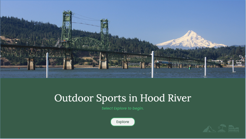 This choose-your-own path interactive activity is designed for visitors to Hood River and the Columbia Gorge. It helps folks think about the land and water sport activities in which they may want to engage. This is a fun subject and I wanted to keep it light with trivia quizzes and easy-to-achieve certificates. Working with subject matter experts (SMEs) is one of my favorite things about working in higher education, but in this case, I could be my own SME since I moved to Hood River about twenty years ago, just to do outdoor sports.